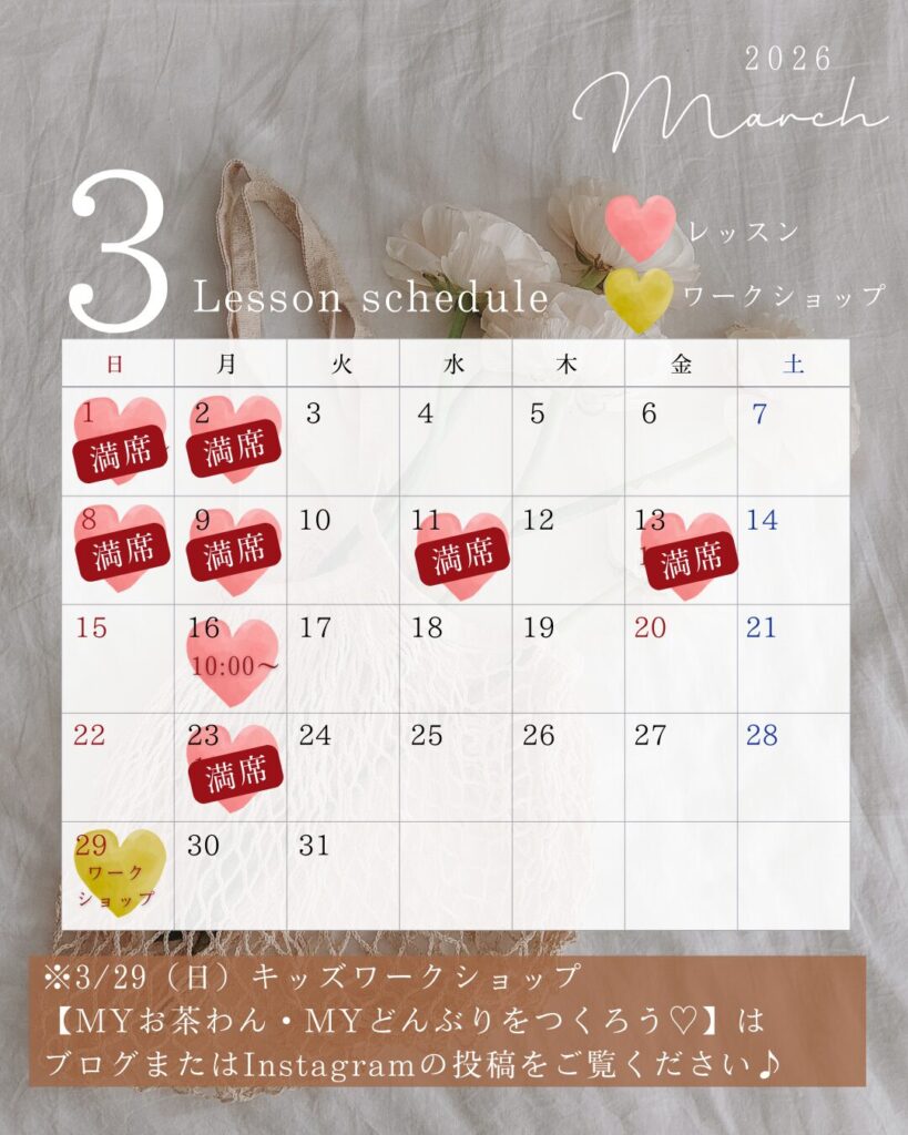 3月レッスンスケジュール 2026 2/22 スケジュール 2026-02-22 ご予約・お問合せはこちら 3/29(日)キッズワークショップはこちら ご縁あってレッスン・ワークショップにお越しいただけますことを、心よりお待ち申し上げます^^ スケジュール よかったらシェアしてね! URLをコピーしました! URLをコピーしました!