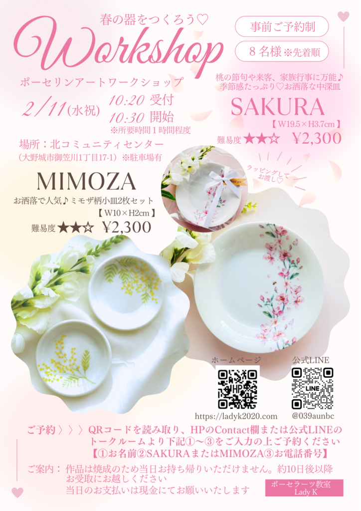 昨年ご好評いただいたこちらのワークショップ 今年は大人気の"ミモザ柄ペア小皿"を加えて開催します♪ お洒落な桜の転写紙を使ってワークショップをしたい♡ 人気のミモザ柄で万能小皿を作りたい♡ 手軽に作れる小皿がメインのワークショップが多いけれど...